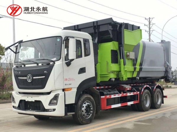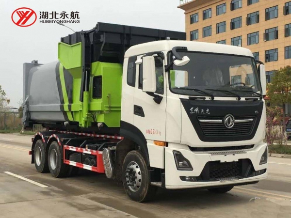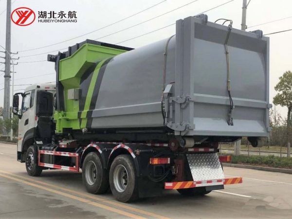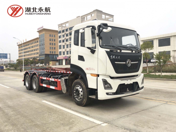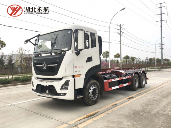 该车主要由拉臂钩总成、可移动箱体总成、液压系统、液压锁紧总成、电液操作系统组成,能实现一车与多个垃圾箱联合循环作业运输,整车具有结构简单、操作方便、装卸效率高、机械自动化程度高、节省人力的优点。