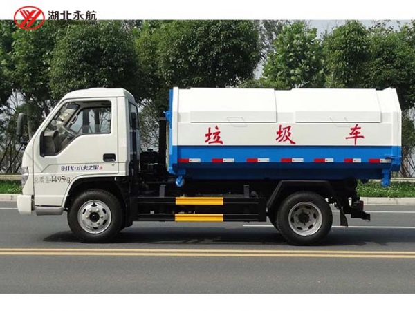 该车主要由拉臂钩总成、可移动箱体总成、液压系统、液压锁紧总成、电液操作系统组成,能实现一车与多个垃圾箱联合循环作业运输,整车具有结构简单、操作方便、装卸效率高、机械自动化程度高、节省人力的优点。