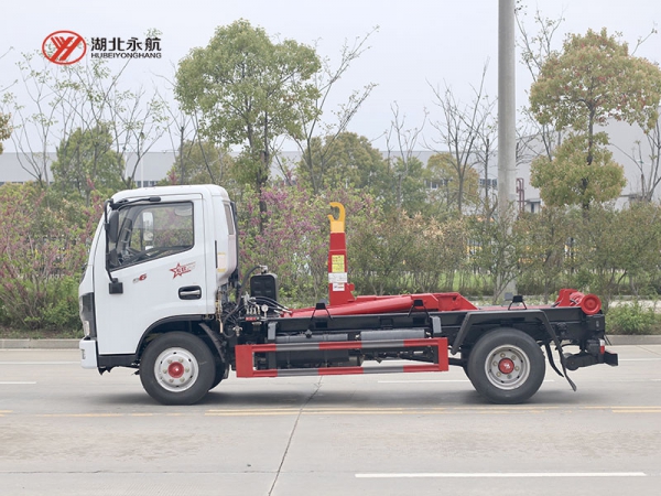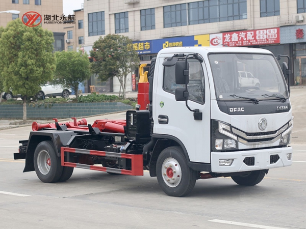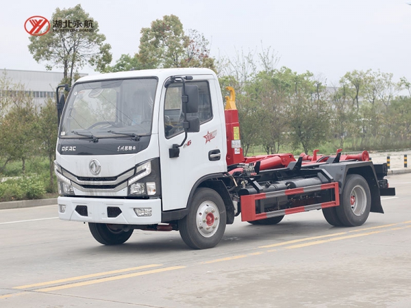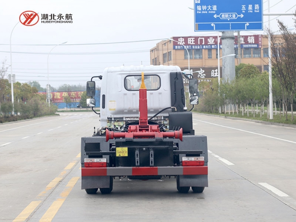 该车主要由拉臂钩总成、可移动箱体总成、液压系统、液压锁紧总成、电液操作系统组成,能实现一车与多个垃圾箱联合循环作业运输,整车具有结构简单、操作方便、装卸效率高、机械自动化程度高、节省人力的优点。
