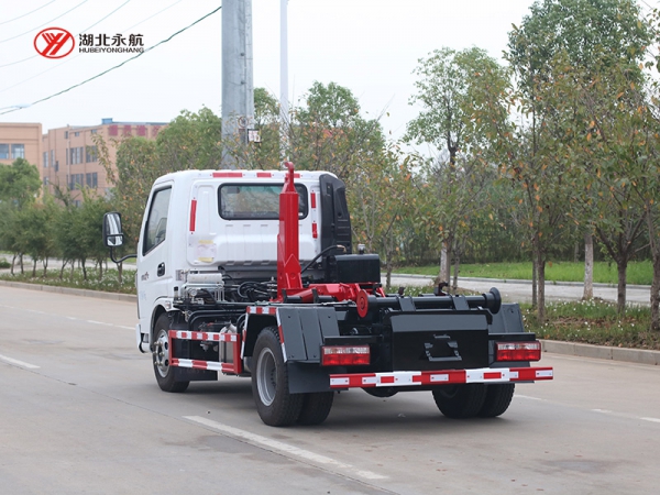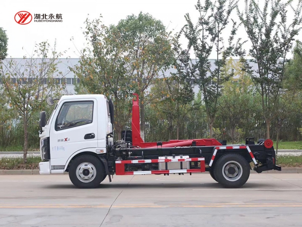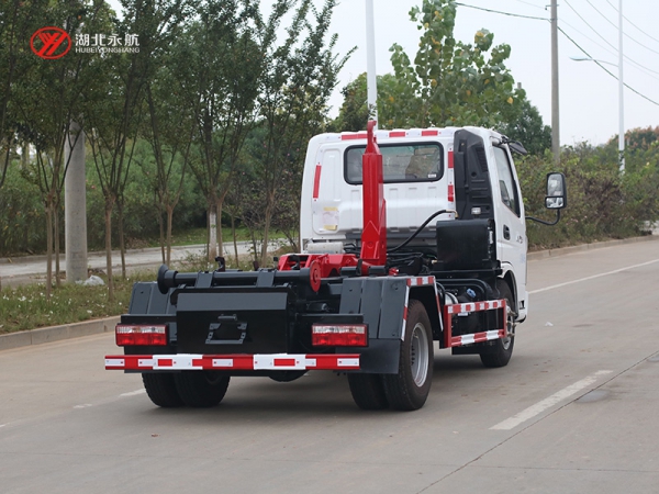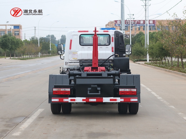 该车主要由拉臂钩总成、可移动箱体总成、液压系统、液压锁紧总成、电液操作系统组成,能实现一车与多个垃圾箱联合循环作业运输,整车具有结构简单、操作方便、装卸效率高、机械自动化程度高、节省人力的优点。
