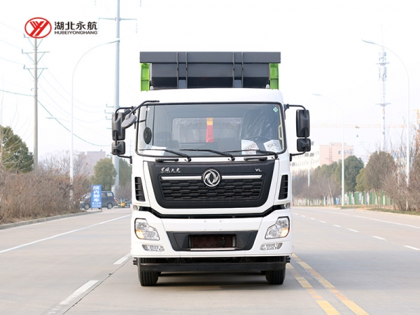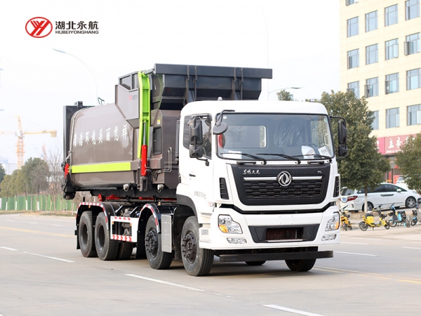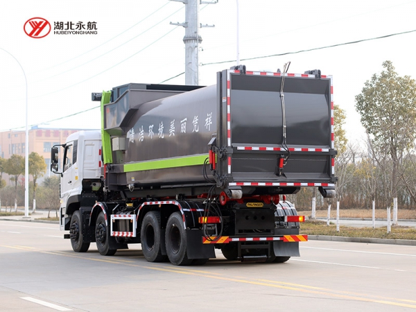 该车主要由拉臂钩总成、可移动箱体总成、液压系统、液压锁紧总成、电液操作系统组成,能实现一车与多个垃圾箱联合循环作业运输,整车具有结构简单、操作方便、装卸效率高、机械自动化程度高、节省人力的优点。