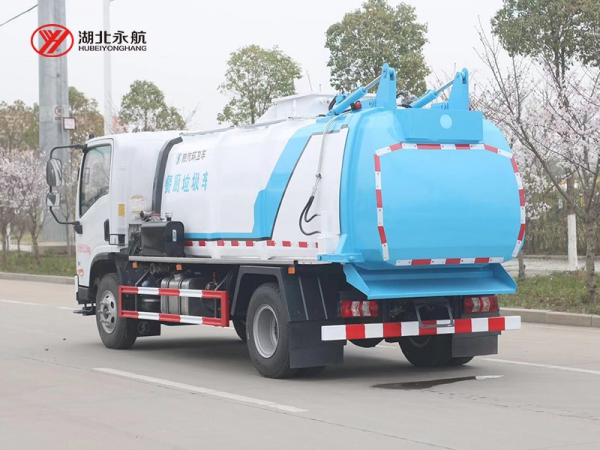 4、箱体尾部导流槽设计,避免卸料时的垃圾飞溅。