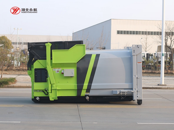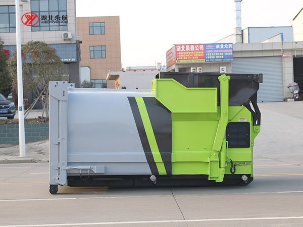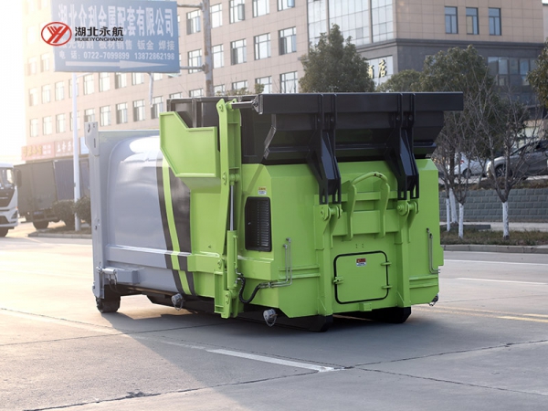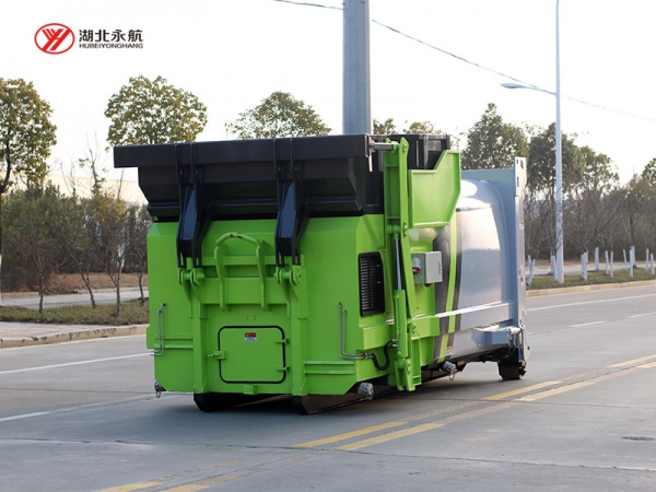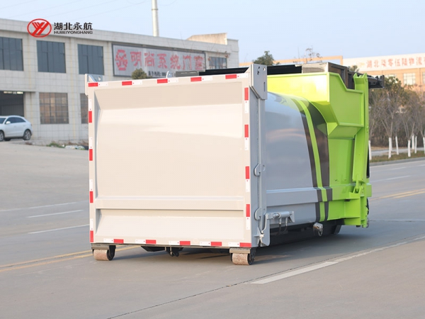 2、垃圾斗或专用塑料桶的举升机构,可将容器内的垃圾倾倒入压缩机料斗及压缩腔的机构,利用推铲油缸的往复运动驱动推铲推出、缩回,实现压缩垃圾的功能。