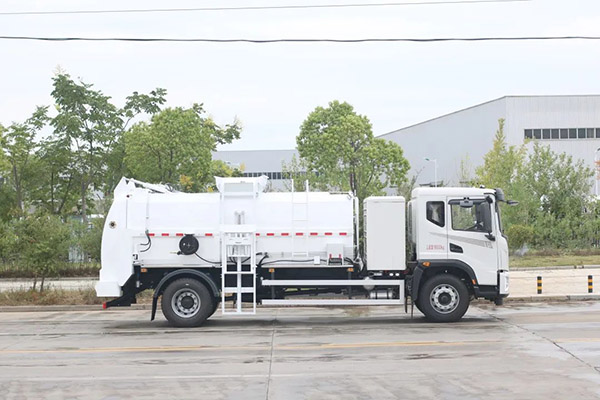 该车采用东风华神T5纯电动二类汽车底盘,上装由箱体、后门总成、后门开启机构、密封锁紧机构、推板机构、挂桶提升机构及操纵机构等组成。