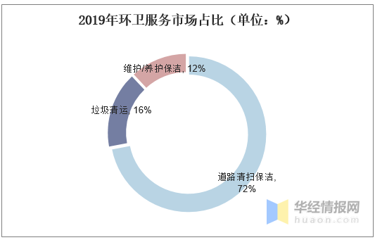 2019年环卫服务市场中,道路清扫保洁占比72%,垃圾清运占比16%,维护/养护保洁占比12%。