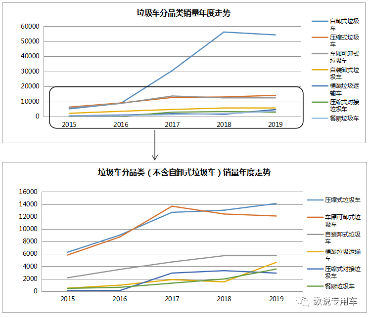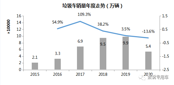 2017年当年垃圾车销量大涨109%,其后2年保持增长,2019年垃圾车年度销量达到了近10万辆。