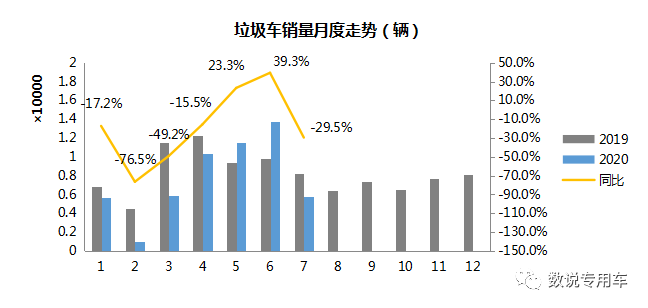 2020年1-7月压缩式垃圾车销量保持增长,稳居各类垃圾车同比增长率前排。