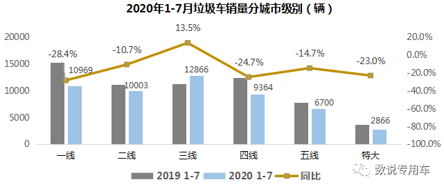 今年1-7月三线城市(大多为地级市)垃圾车销量呈增长态势,其它城市销量均为负增长。