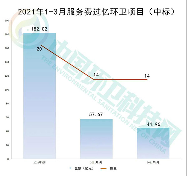 对于今年的亿级环卫市场来说,虽然1月份开了个好头,却在2、3月份接连遭遇“山体滑坡”,整体情况较为低迷。2021年一季度共开标48个亿级环卫项目,中标金额合计284.65亿元。其中,1、2、3月份中标个数分别为20个、14个、14个;中标金额分别为182.02亿元、57.67亿元、44.96亿元,总体呈明显下降趋势。3月份共中标14个亿级环卫项目,中标金额为44.96亿元。