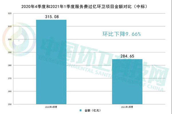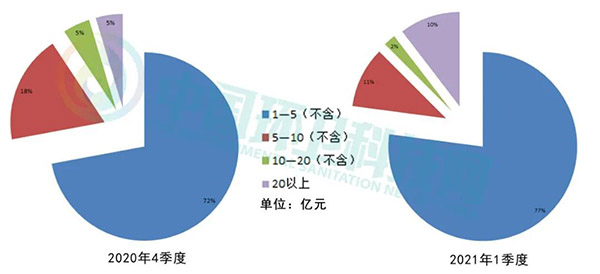2020年四季度亿级环卫项目总中标金额为315.08亿元,与之相比,今年一季度环比下降9.66%。另外,2020年四季度和2021年一季度亿级项目中标个数分别为44个、48个。虽然中标总数量变化不大,但如果按金额、规模细分,可以看出不同区间的项目数量变动幅度较大。