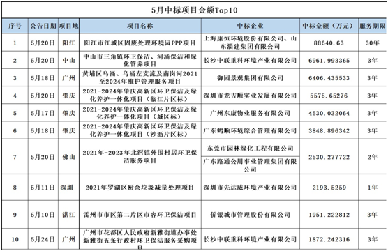 预算金额前三的项目分别为珠海的“高新区市政综合管养服务(2021年7月1日~2022年6月30日)”、惠州的“大亚湾西区街道(2021-2024)环卫服务市场化采购项目”、清远的“清新区环境卫生服务项目”,占本月采购意向预算总金额近半份额。
