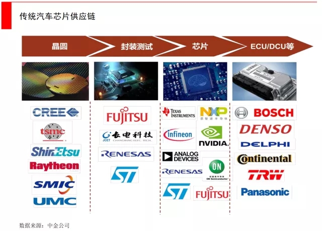 在汽车电子的各个方面,使用了大量的MCU单片机。由于IC(微型电子器件)小型化和高频的需求,MCU需要40nm以下的制程,大部分IDM(数据复用设备)都把芯片生产外包给台积电(TSMC)等代工厂, TMSC生产出货量约占所有汽车MCU70%的市场份额。由于汽车MCU芯片的市场也是高度集中的,排名前7位的MCU供应商约占需求的98%。当时的瓶颈是台积电,由于汽车业务仅仅占它3%的总收入,这个瓶颈一时半会没有解决。随着各国政府还有车企的斡旋,台积电这块的瓶颈逐步突破。
