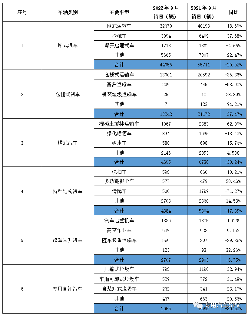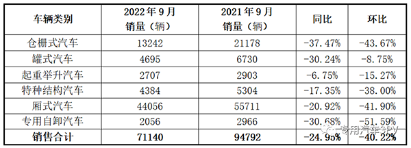 2022年9月专用汽车六大类产品累计销售7.1万辆,同比下滑24.95%,环比下滑40.22%。其中,厢式汽车销售4.41万辆,同比下滑20.92%;仓栅式汽车销售1.32万辆,同比下滑37.47%;罐式汽车销售0.47万辆,同比下滑30.24%;特种结构汽车销售0.44万辆,同比下滑17.35%;起重举升汽车销售0.27万辆,同比下滑6.75%;专用自卸汽车销售0.12万辆,同比下滑30.68%。2022年9月专用汽车六大类产品销量情况统计表