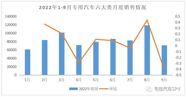 从数据来看,2022年9月专用汽车六大类同比环比均出现较大幅度回落,主要是疫情散发多发及一些极端天气、市场需求恢复相对较弱、企业盈利能力下降等因素影响,企业生产经营较困难。2022年1-9月累计销售专用汽车六大类产品共75.65万辆,同比下滑38.47%,较2022前8月提升1.44个百分点。其中,厢式汽车累计销售43.65万辆,同比下滑31.89%;仓栅式汽车累计销售15.5万辆,同比下滑44.96%;罐式汽车累计销售5.56万辆,同比下滑59.84%;特种结构汽车累计销售5.10万辆,同比下滑27.26%;起重举升汽车累计销售3.40万辆,同比下滑50.86%;专用自卸汽车累计销售2.44万辆,同比下滑16.42%。2022年1-9月专用汽车六大类产品销量情况统计表