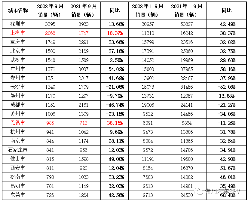 2022年9月我国31个省份、自治区、直辖市实现专用汽车销售7.1万辆,仅上海和福建同比增长,其他各省市同比均呈现不同程度的下滑,尤其是新疆、西藏、天津等地受疫情影响较大,同比下滑超50%以上,其次贵州、四川等地的自然灾害对当地也有较大影响。当月上牌数排名前五的省份是广东省0.85万辆,同比下滑37.42%;江苏省当月上牌0.54万辆,同比下滑8.53%;山东省0.52万辆,同比下滑33.52%;湖北省0.46万辆,同比下滑8.12%;云南当月上牌0.45万辆,同比下滑10.27%。2022年1-9月各省市整体较去年同期平均降幅36%。北京、上海、广州、深圳等经济发达城市和武汉、郑州等农产品集聚地是专用车产品主要流向地。9月份,Top20的城市中仅上海和无锡实现销量正增长,分别同比增长18.37%和38.15%(见下表)。2022年9月各省市专用汽车产品需求情况统计表