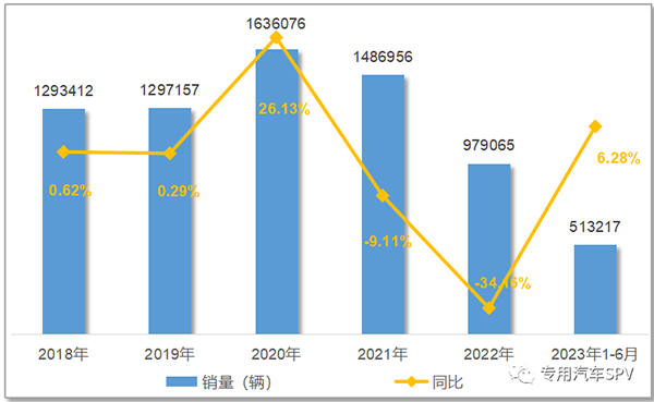 从近几年的数据来看,2020年专用车销量达到最高峰,2022年年销量创新低。2023年上半年971家专用汽车企业累计销售51.32万辆,在去年较低的基数上同比增长6.28%。2018-2023年全国专用汽车年度销量情况