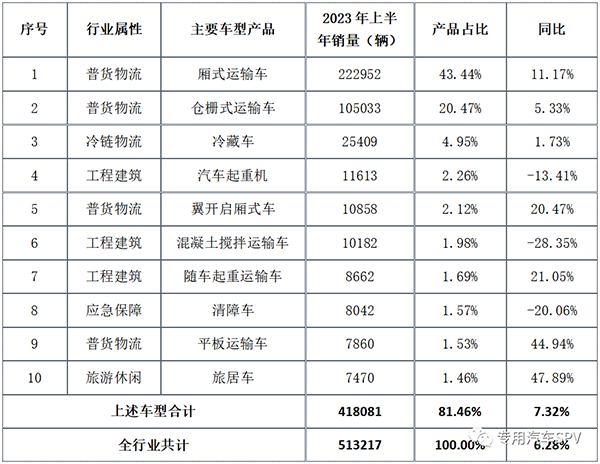 2023年上半年专用汽车六大类中,厢式汽车累计销售29.50万辆,同比上涨10.50%;仓栅式汽车累计销售10.67万辆,同比上涨5.17%;罐式汽车累计销售3.50万辆,同比下滑13.19%;特种结构车累计销售3.51万辆,同比上涨2.29%;起重举升汽车累计销售2.64万辆,同比上涨6.00%;专用自卸汽车累计销售1.50万辆,同比上涨0.57%。可以看出,2023年上半年仅罐式汽车同比下滑13.19%,其他五大类同比呈现不同幅度上涨。如下图:2023年上半年专用汽车六大类产品销量情况表