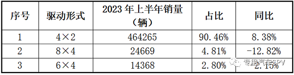 从产品能源结构来看,2023年上半年新能源(纯电动、燃料电池、混合动力)专用汽车共7.67万辆,同比增长106.61%。上半年新能源渗透率达到14.94%,比同期的7.68%提升7.26个百分点,近2倍速增长。如下图,内圈为2022年上半年能源情况,外圈为2023年能源情况。从吨位来看,2023年上半年各吨位占比与去年同期相比整体变化不大,仍以轻型车(含微型、皮卡、MPV)为主,占比超70%,其中轻客(含微客、MPV)改装的专用车占比15.83%,较去年同期轻客占比提升6.67个百分点。2023年上半年,专用汽车主要驱动形式有4×2、8×4和6×4这三种,其中90.46%的驱动形式为4×2,较去年同期上涨8.38%;其次是8×4,但较去年同期下滑12.82%;驱动形式为6×4的车辆较去年同期下滑2.15%。上半年经济运行呈现恢复向好态势,转型升级扎实推进,工业经济新动能不断积聚,产业结构持续优化。但也要看到,国际政治经济形势错综复杂,世界经济复苏乏力,对我国工业发展带来诸多影响,工业生产经济运行仍面临较大压力。